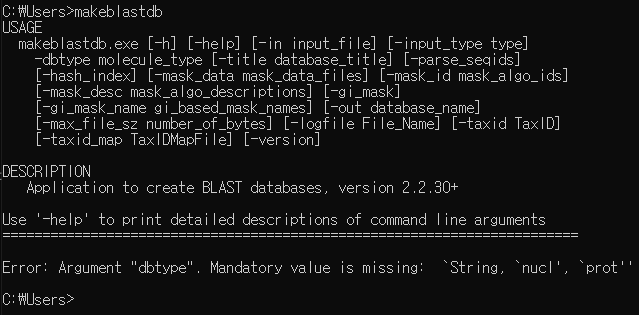 어떤 주소로 떠있던 상관없습니다. Path 설정을 했기 때문에(저는 exe 파일을 받아 설치 때 자동으로 설정되었습니다) 여기에다가 "makeblastdb"라고 입력합니다. 그러면 아래와 같은 내용을 확인할 수 있습니다.