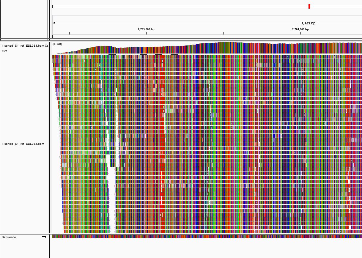 도구 창에 File > Load from file… 을 클릭한 후 bam 파일을 입력합니다. 그러면 아래와 같은 그림을 볼 수 있습니다. 처음만 어렵고 다음번에는 참조 염기서열 준비, bam file 준비 후 bai 파일 뚝딱 만들고 IGV 안에 입력하면 돼서 별로 시간이 걸리지 않습니다.