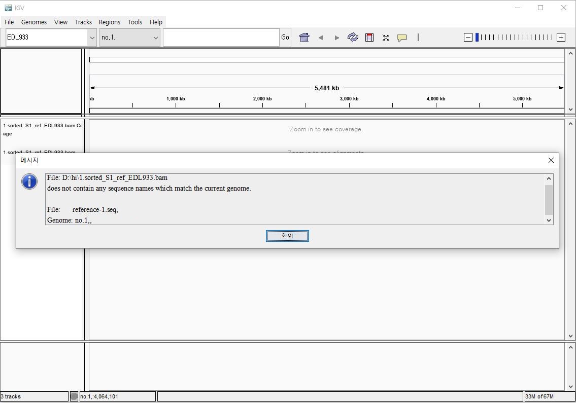 . genome 파일은 no.1....으로 시작하는데, bam과 bai 파일은 reference...로 시작하기 때문에 매칭이 안되고 있습니다. 이때 먼저 해야 할 것은